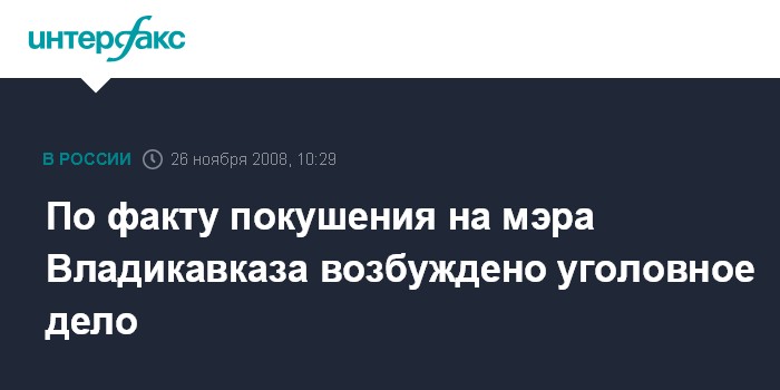 Москва. 26 ноября. INTERFAX.RU - По факту покушения на главу администрации Владикавказа Виталия Караева, в результате которого он погиб, возбуждено уголовное дело по двум статьям УК РФ.