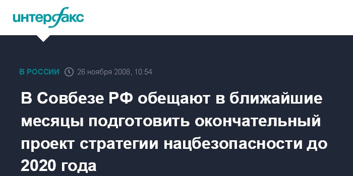 Москва. 26 ноября. INTERFAX.RU - Окончательный проект стратегии национальной безопасности РФ до 2020 г. будет подготовлен в ближайшие месяцы, сообщил журналистам в Петербурге в среду представитель Совета безопасности.
