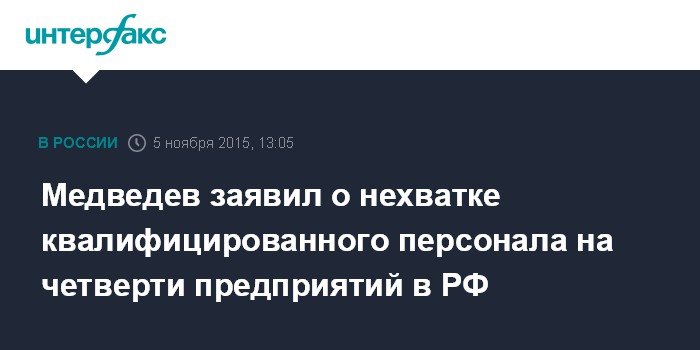 Москва. 5 ноября. INTERFAX.RU - Премьер-министр РФ Дмитрий Медведев отмечает недостаток квалифицированного персонала практически на четверти российских предприятий/