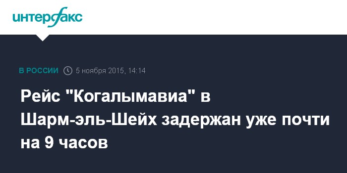 Москва. 5 ноября. INTERFAX.RU - Согласно информации онлайн-табло аэропорта "Пулково", вылет рейса Петербург - Шарм-эль-Шейх 7К 9267 авиакомпании "Когалымавиа" в четверг перенесен с 8:20 на 17:05.