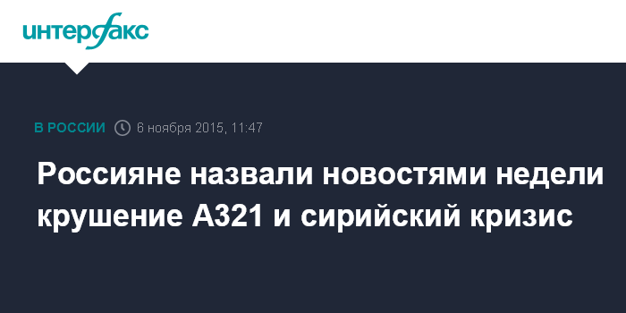 Более четверти опрошенных (26%) поставили авиакатастрофу над Синаем на главное место в списке новостей недели, которые больше всего волновали россиян. Столько же (26%) отметили сообщения о ситуации в Сирии и вокруг нее, военную операцию России в этой стране.