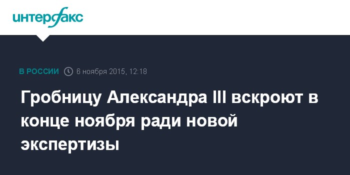 Москва. 6 ноября. INTERFAX.RU - Гробница императора Александра III в рамках новой экспертизы по делу о гибели последней российской царской семьи будет вскрыта в конце ноября, сообщил в интервью "Интерфаксу" в пятницу старший следователь-криминалист Главного управления криминалистики СК России Владимир Соловьев.