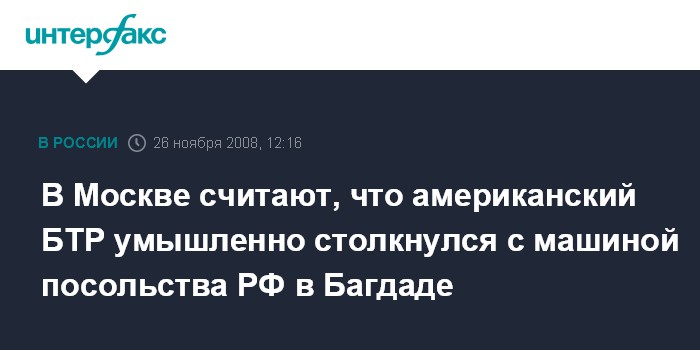 Москва. 26 ноября. INTERFAX.RU -Россия в жесткой форме потребовала от США расследования и наказания виновных в инциденте, в ходе которого 19 ноября американский БТР врезался в автомобиль посольства РФ в Багдаде.