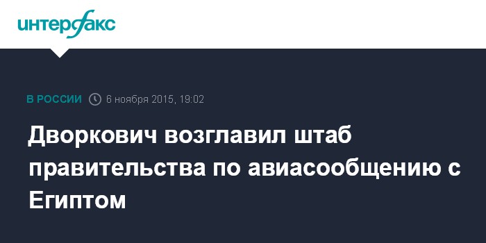 "По поручению президента, правительство РФ сформировало оперативный штаб по регулированию вопросов, связанных с временным приостановлением авиасообщения с Египтом. Премьер-министр Дмитрий Медведев поручил возглавить штаб своему заместителю Аркадию Дворковичу", - говорится в сообщении пресс-службы российского кабмина.