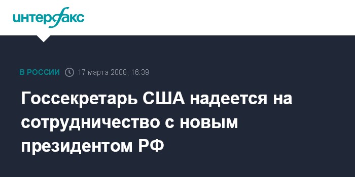 Москва. 17 марта. INTERFAX.RU - Госсекретарь США Кондолиза Райс заявила, что Вашингтон рассчитывает на дальнейшее взаимодействие с Москвой после того как избранный президент РФ Дмитрий Медведев вступит в должность.
