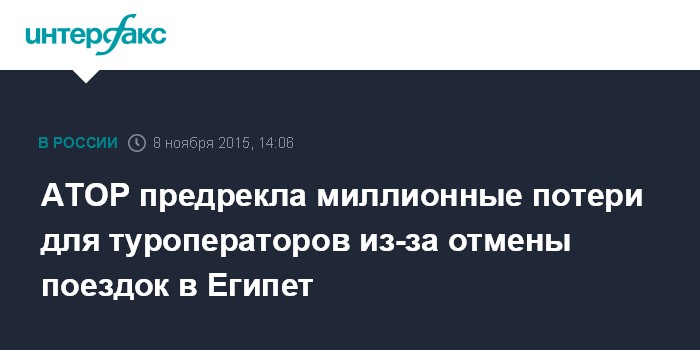 Москва. 8 ноября. INTERFAX.RU - Потери туроператоров при аннуляции всех проданных туров в Египет могут составить сотни миллионов долларов, так что поддержка государства им не помешает, заявил порталу "Интерфакс-Туризм" в воскресенье первый вице-президент Ассоциации туроператоров России (АТОР) Владимир Канторович.