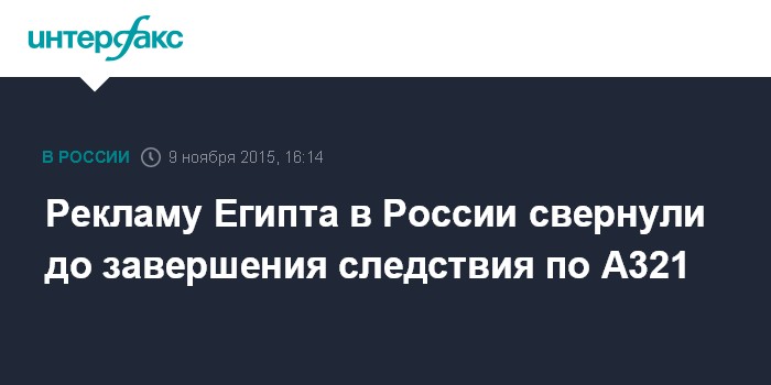 Москва. 9 ноября. INTERFAX.RU - Министерство туризма Египта остановило рекламную кампанию в России и еще пяти странах, из которых приезжает большинство туристов, до завершения расследования по крушению лайнера А321, сообщает в понедельник Dailynewsegypt.com.