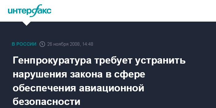 "Генеральная прокуратура РФ провела проверки в Федеральном агентстве воздушного транспорта (Росавиация), Федеральной службе по надзору в сфере транспорта (Ространснадзор) и их территориальных подразделениях, а также на авиапредприятиях. В ходе проверки выявлены серьезные нарушения требований Воздушного кодекса РФ и законодательства, регламентирующего вопросы обеспечения безопасности полетов и авиационной безопасности", - сообщили "Интерфаксу" в среду официальный представитель Генпрокуратуры РФ Марина Гриднева.