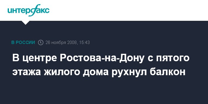 Москва. 26 ноября. INTERFAX.RU - В Ростове-на-Дону спасатели ликвидируют последствия обрушения балконной конструкции многоэтажного жилого дома. "Обрушение балкона произошел в 14:38 мск на пятом этаже пятиэтажного дома по проспекту Ворошиловскому,8. При этом конструкция обрушилась на балкон четвертого этажа", - сообщил агентству "Интерфакс-Юг" в среду представитель областного департамента по предупреждению и ликвидации ЧС (ДПЧС).