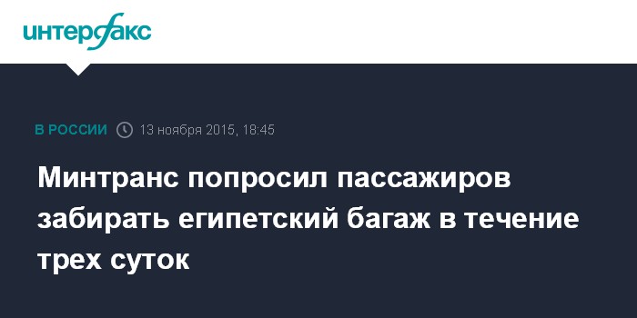Москва. 13 ноября. INTERFAX.RU - Министерство транспорта призывает пассажиров, возвращающихся из Египта, забирать свой багаж из аэропортов в течение трех дней после получения извещения о его прибытии, говорится в сообщении на сайте ведомства.