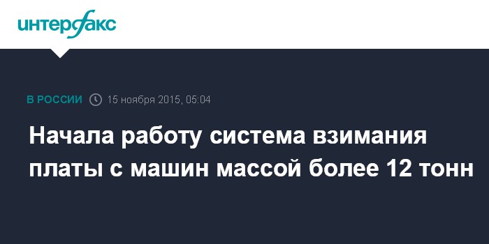Москва. 15 ноября. INTERFAX.RU - С 15 ноября на территории России заработала система взимания платы в счет возмещения вреда, причиняемого автомобильным дорогам общего пользования федерального значения транспортными средствами, имеющими разрешенную максимальную массу свыше 12 тонн.