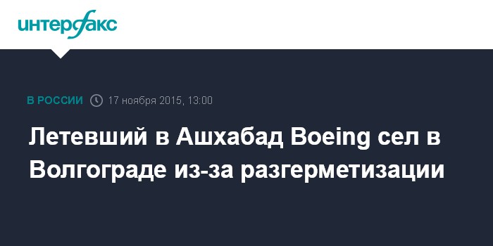 Москва. 17 ноября. INTERFAX.RU - Самолет Boeing 737 "Туркменских авиалиний", выполнявший рейс из Москвы в Ашхабад, вынужден был прервать полет и приземлиться в Волгограде из-за разгерметизации, сообщил "Интерфаксу" источник в экстренных службах.