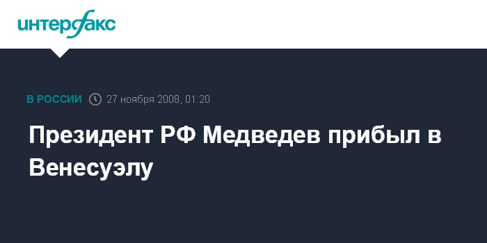 Каракас. 27 ноября. ИНТЕРФАКС - Президент РФ Дмитрий Медведев прибыл с официальным визитом в Венесуэлу, где проведет переговоры с президентом республики Уго Чавесом и вместе с ним посетит российский тяжелый ракетный крейсер "Петр Великий".