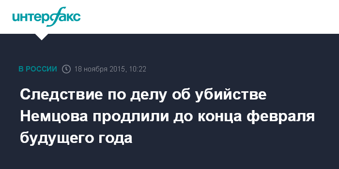 Москва. 18 ноября. INTERFAX.RU - Срок следствия по делу об убийстве политика Бориса Немцова продлен до февраля 2016 года.
