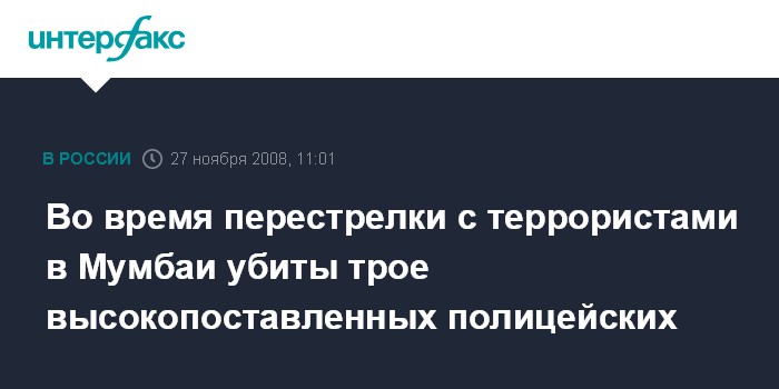 Москва. 27 ноября. INTERFAX.RU - Три высокопоставленных офицера полиции скончались от ранений, полученных в результате столкновений с террористами, совершившими несколько терактов в индийском городе Мумбаи в вреду, сообщает газета Times of India.