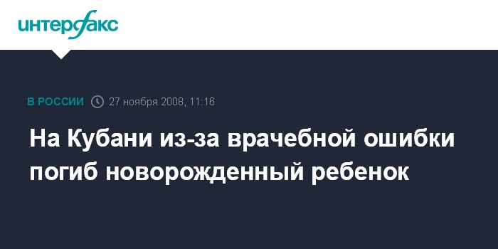 Москва. 27 ноября. INTERFAX.RU - Возбуждено уголовное дело по факту смерти новорожденного мальчика в акушерском отделении МУЗ "Центральная городская больница города Кропоткина" (Краснодарский край). Как сообщает в четверг СКП РФ, дело возбуждено по ч. 2 статьи 109 УК РФ (причинение смерти по неосторожности вследствие ненадлежащего исполнения лицом своих профессиональных обязанностей).