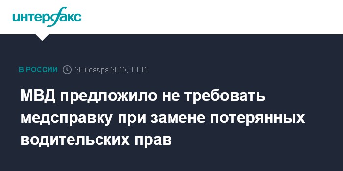 Москва. 20 ноября. INTERFAX.RU - МВД России предлагает избавить водителей от необходимости представлять медсправку при замене водительского удостоверения из-за изменений персональных данных, порчи или утраты документа, а также при получении международных прав.