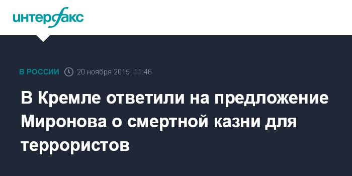 Москва. 20 ноября. INTERFAX.RU - Пресс-секретарь президента Дмитрий Песков воздержался от развернутых комментариев по поводу предложения председателя думской фракции "Справедливая Россия" Сергея Миронова применять смертную казнь для террористов, отметив, что пока в Кремле исходят из моратория на эту меру наказания.