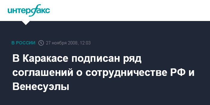 Москва. 27 ноября. INTERFAX.RU - По завершении официальных переговоров между президентами России и Венесуэлы в Каракасе подписан ряд документов.
