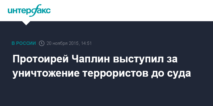 "Вот так свободно нам и нужно вновь обсуждать и решать этот вопрос, оценивая угрозы, уровень безопасности в обществе и различные способы ее обеспечения. Террористов же, а также организаторов и спонсоров терактов можно и нужно просто уничтожать без всякого суда и без всякой процедуры в тех случаях, когда правоохранительные органы точно установили, что речь идет о людях, представляющих общественную опасность", - считает представитель РПЦ.