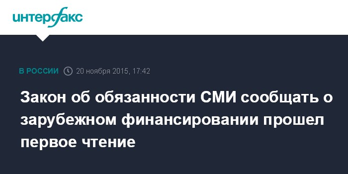 Москва. 20 ноября. INTERFAX.RU - Госдума в пятницу приняла в первом чтении проект закона об обязанности СМИ уведомлять Роскомнадзор о финансировании из-за рубежа.