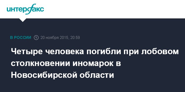 Москва. 20 ноября. INTERFAX.RU - Крупное ДТП с участием легковых автомобилей Suzuki и Toyota унесло жизни четверых человек в Каргатском районе Новосибирской области, сообщает пресс-служба ГУ МВД по региону в пятницу.