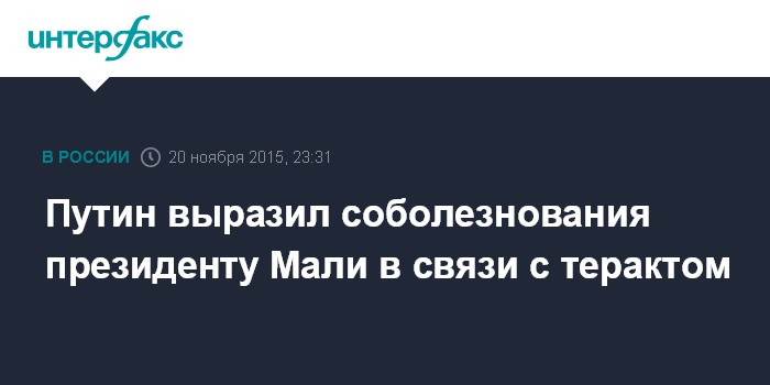Москва. 20 ноября. INTERFAX.RU - Президент России Владимир Путин направил телеграмму президенту Мали Ибрагиму Бубакару Кейте, в которой выразил соболезнования в связи с терактом, произошедшим в столице республики и приведшим к многочисленным человеческим жертвам, сообщил пресс-секретарь главы российского государства Дмитрий Песков.