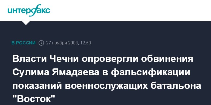 Москва. 27 ноября. INTERFAX.RU - Пресс-служба президента Чечни назвала беспочвенными размещенные в ряде СМИ комментарии экс-командира батальона "Восток" Сулима Ямадаева о том, что показания его бывших сотрудников сфальсифицированы.