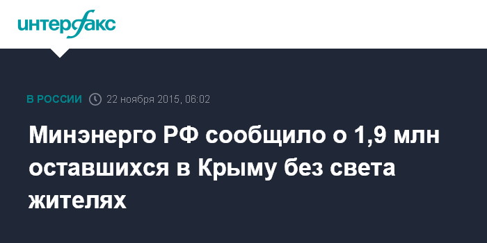 Москва. 22 ноября. INTERFAX.RU - В результате отключения в Крыму электроэнергии без света остались 1,9 млн человек, сообщает пресс-служба Минэнерго РФ в воскресенье.