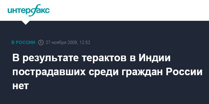 Москва. 27 ноября. INTERFAX.RU - Граждане России не пострадали в результате терактов в индийском городе Мумбаи, заявляет МИД РФ.