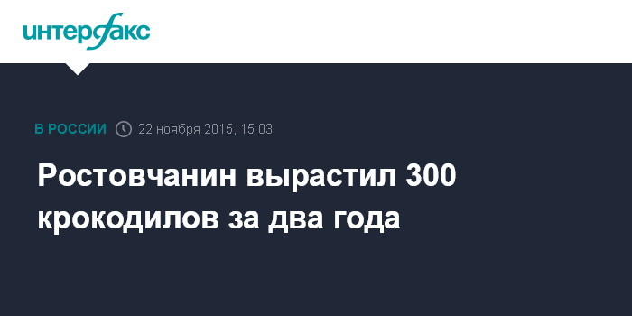 Москва. 22 ноября. INTERFAX.RU - Единственному заводчику крокодилов в Южном федеральном округе Даниилу Попову за два года удалось вырастить более 300 рептилий, сообщили в пресс-центре Ростовской областной станции по борьбе с болезнями животных.