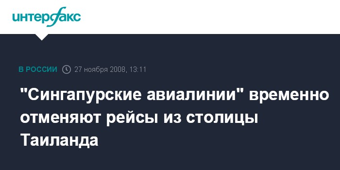 В компании указали, что, "принимая во внимание ситуацию в аэропорту Суваннапум, более точную информацию о времени возобновления рейсов дать не представляется возможным". В сообщении отмечается также, что штрафы за аннулирование и перенос дат пассажирам, имеющим билеты на рейсы "Сингапурских авиалиний" в Бангкок, отменены. "Это касается билетов, выписанных до 26 ноября и распространяющихся на перелеты до 7 декабря 2008 года включительно", - отметили во Fleishman-Hillard.
