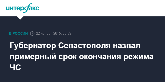 Москва. 22 ноября. INTERFAX.RU - Режим чрезвычайной ситуации, введенный в Севастополе из-за отключения электроэнергии на Крымском полуострове из-за подрыва питающих регион ЛЭП на юге Украины, может продлиться до 24 ноября, однако дата может быть скорректирована, считает губернатор Севастополя Сергей Меняйло.