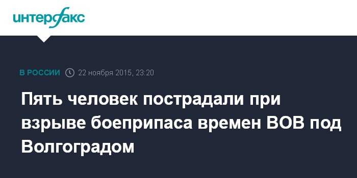 Москва. 22 ноября. INTERFAX.RU - При взрыве боеприпаса времен Великой Отечественной войны в Октябрьском районе Волгоградской области пострадали пять человек, сообщили "Интерфаксу" в экстренных службах региона.