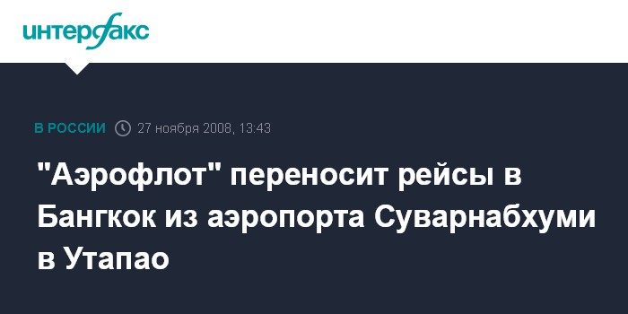 Москва. 27 ноября. INTERFAX.RU - ОАО "Аэрофлот - российские авиалинии" переводит рейсы в Бангкок из аэропорта Суварнабхуми в аэропорт Утапао, говорится в сообщении авиакомпании.