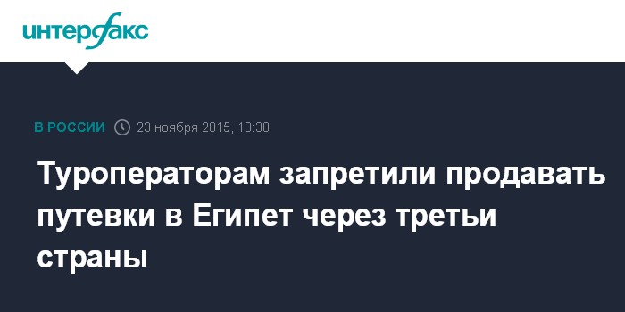 Москва. 23 ноября. INTERFAX.RU - Туроператорам запрещено продавать россиянам туры в Египет напрямую и через третьи страны, сообщил журналистам в понедельник глава Ростуризма Олег Сафонов.