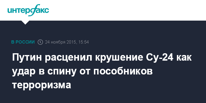 Москва. 24 ноября. INTERFAX.RU - Крушение российского Су-24 в Сирии - это удар в спину, который нанесли пособники терроризма. Об этом заявил президент РФ Владимир Путин в ходе встречи с королем Иордании Абдаллой II, которая проходит во вторник в Сочи.