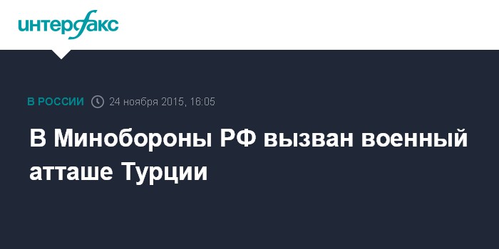 Москва. 24 ноября. INTERFAX.RU - Военный атташе Турции в РФ вызван в министерство обороны России, сообщили "Интерфаксу" в военном ведомстве.
