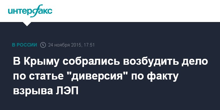 Москва. 24 ноября. INTERFAX.RU - Прокуратура Крыма может возбудить уголовное дело по статье "диверсия" по факту взрыва линии электропередач (ЛЭП), заявила прокурор республики Наталья Поклонская.