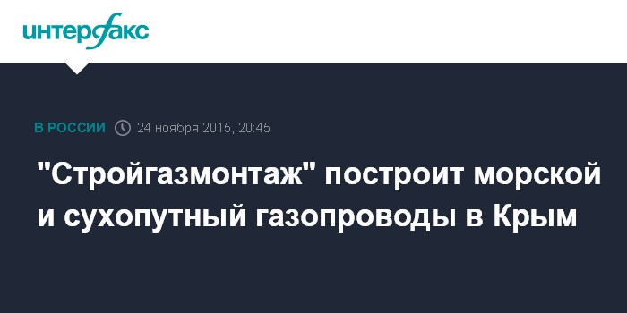 Москва. 24 ноября. INTERFAX.RU - "Стройгазмонтаж" Аркадия Ротенберга займется строительством как морской части газопровода Кубань-Крым через Керченский пролив, так и сухопутным газопроводом Симферополь-Севастополь, говорится в материалах Минэнерго.