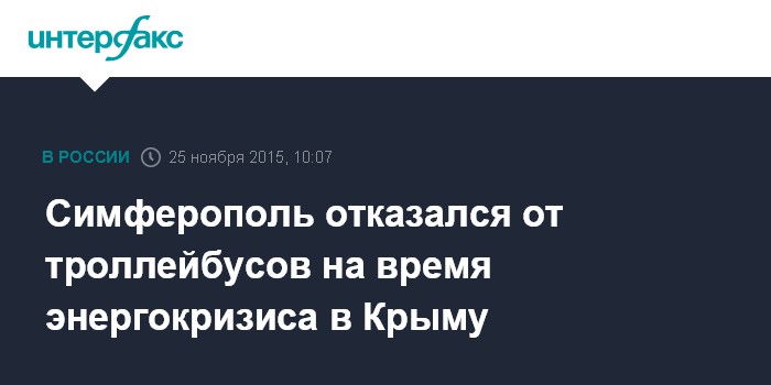 Москва. 25 ноября. INTERFAX.RU - Движение троллейбусов приостановлено в крымской столице - Симферополе - со среды, 25 ноября, на время ЧС в Крыму для экономии электроэнергии, их заменили автобусами, сообщила пресс-служба министерства транспорта Крыма.