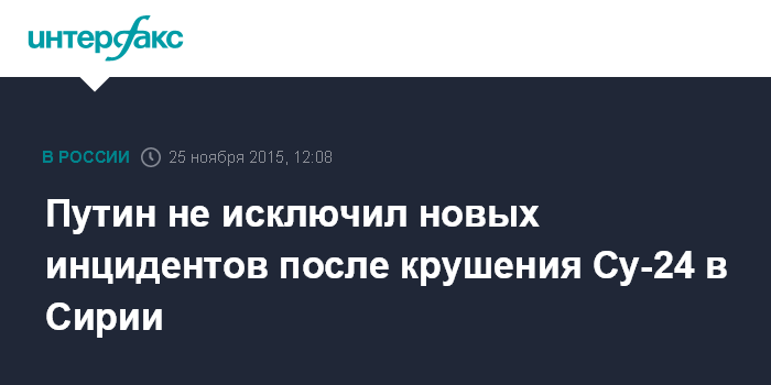 Москва. 25 ноября. INTERFAX.RU - После крушения Су 24 у границы с Турцией нельзя исключить других инцидентов, и в этом случае Россия будет вынуждена на них реагировать, заявил президент РФ Владимир Путин в Нижнем Тагиле.