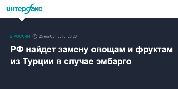 Москва. 25 ноября. INTERFAX.RU - Министр сельского хозяйства РФ Александр Ткачев считает, что Россия в случае "заморозки" торговых отношений с Турцией может заместить импорт овощей и фруктов из этой страны поставками из других стран.
