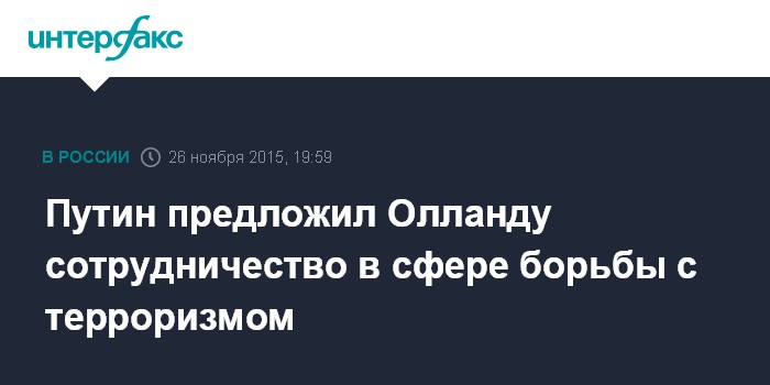 Москва. 26 ноября. INTERFAX.RU - Россия готова к сотрудничеству с Францией в борьбе с терроризмом, заявил в четверг президент Владимир Путин перед началом встречи с президентом Франции Франсуа Олландом в Москве.