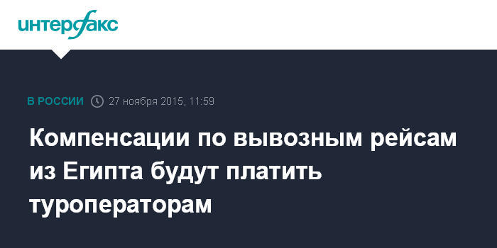 Москва. 27 ноября. INTERFAX.RU - Компенсация по вывозу туристов из Египта будет предоставляться туроператорам, а не авиакомпаниям, говорится в сообщении Минтранса РФ.