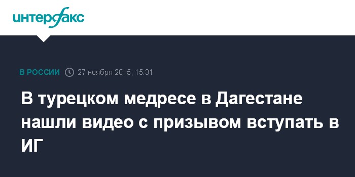 Москва. 27 ноября. INTERFAX.RU - Полицейские обнаружили видеоматериалы с призывами воевать на стороне запрещенного в России "Исламского государства" в закрытом судом медресе неправительственного религиозного фонда "Сулейманджи" (Турция) в дагестанском Дербенте, сообщает пресс-служба ГУ МВД по СКФО в пятницу.