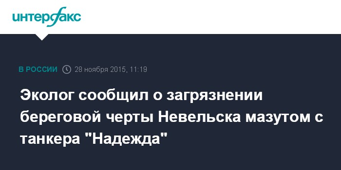 Москва. 28 ноября. INTERFAX.RU - Почти вся береговая черта вдоль города Невельска загрязнена нефтепродуктами от выброшенного на мель утром в субботу танкера "Надежда", сообщил "Интерфаксу" руководитель региональной общественной организации (РОО) "Экологическая вахта Сахалина" Дмитрий Лисицын.