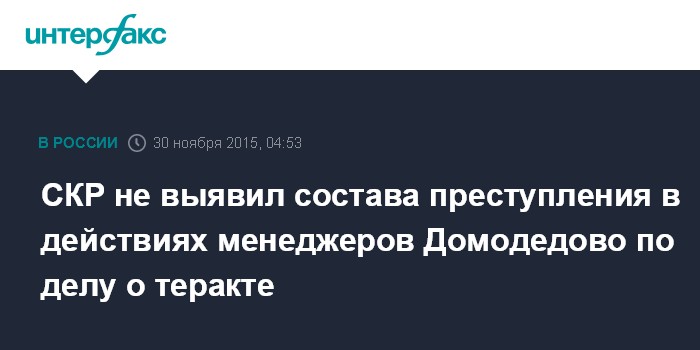 Москва. 30 ноября. INTERFAX.RU - СКР после 53 месяцев расследования уголовного дела о неисполнении требований транспортной безопасности (ч. 3 ст. 263-1 УК РФ), возбужденного в связи с терактом в 2011 году в аэропорту Домодедово, установил, что в действиях восьми его фигурантов отсутствует состав преступления, пишет в понедельник газета "Коммерсант", ссылаясь на имеющиеся в распоряжении материалы расследования.