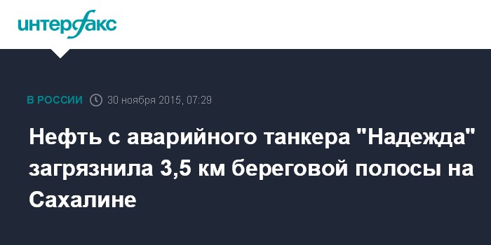 Москва. 30 ноября. INTERFAX.RU - Нефтепродуктами с танкера "Надежда", выброшенного 28 ноября утром на мель в акватории города Невельска, загрязнено 3,5 км побережья, сообщает пресс-служба ГУ МЧС по Сахалинской области в понедельник.