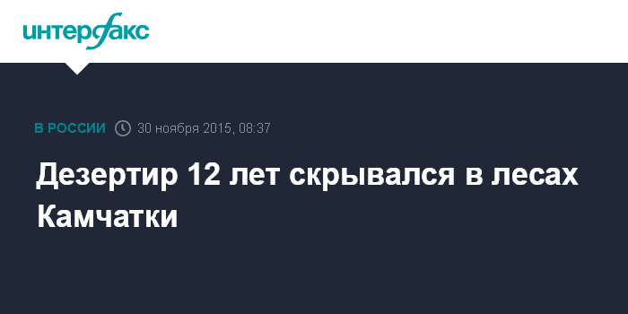 Москва. 30 ноября. INTERFAX.RU – Полицейские на Камчатке в понедельник задержали дезертира, сбежавшего из местной воинской части еще в 2003 году и все это время прятавшегося в камчатских лесах.